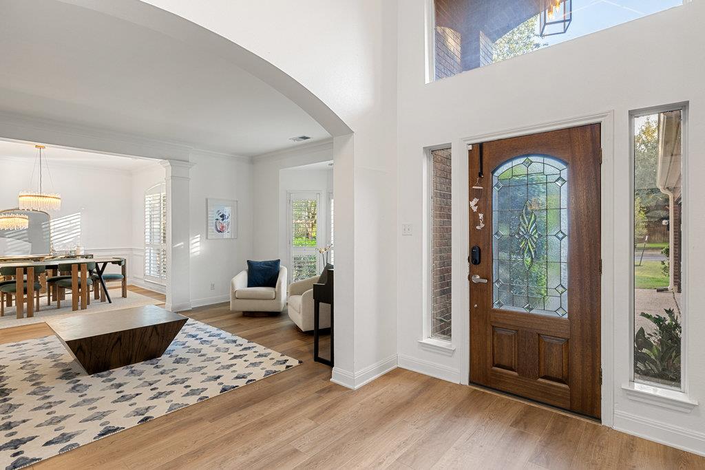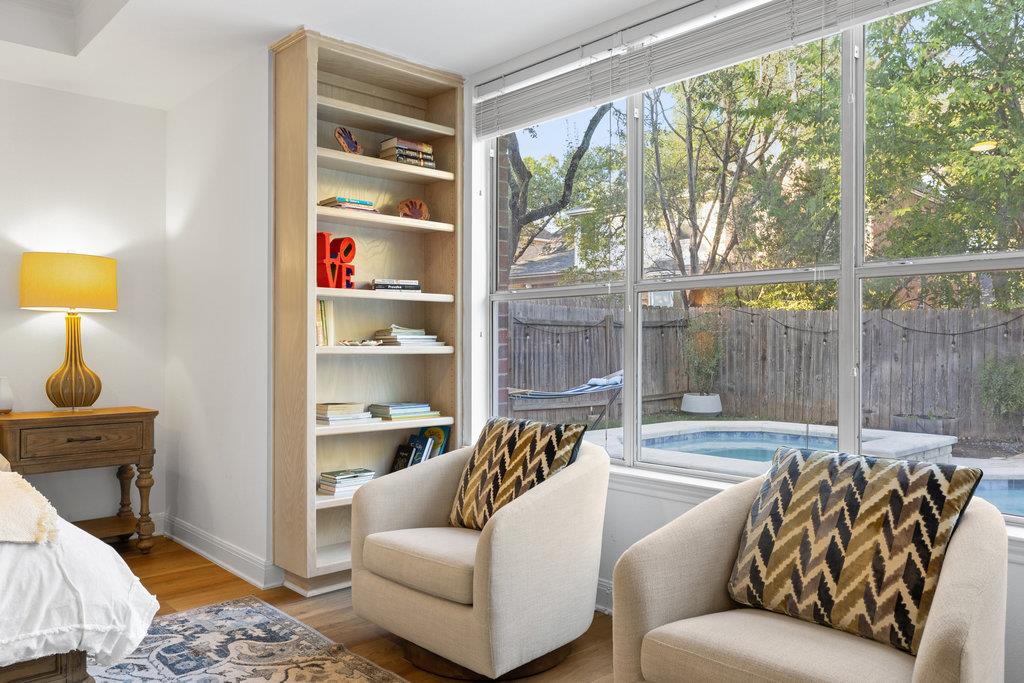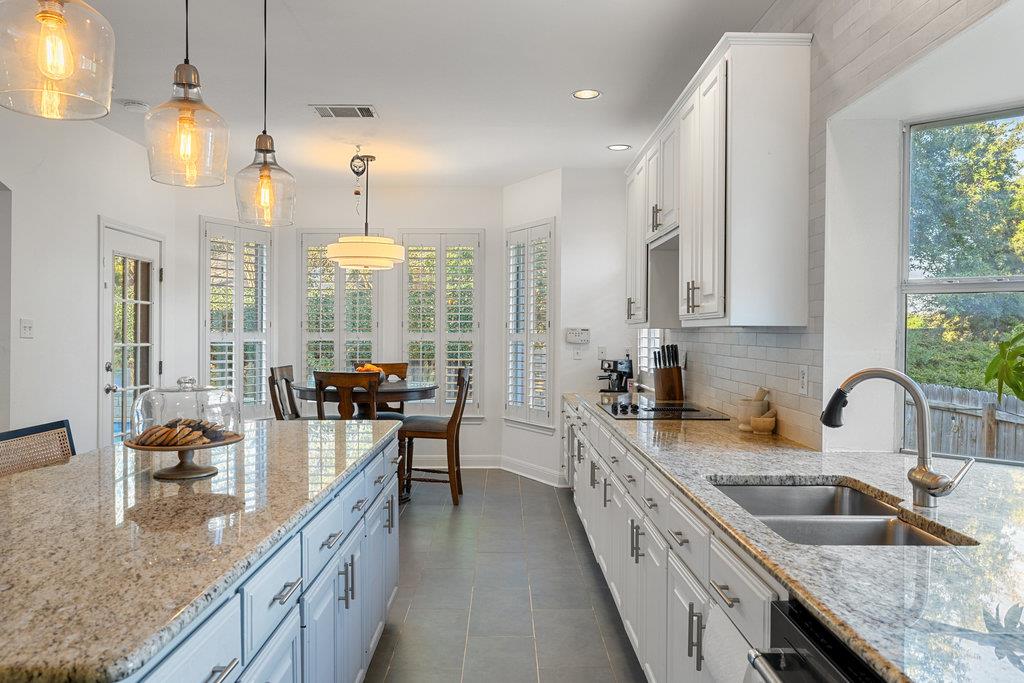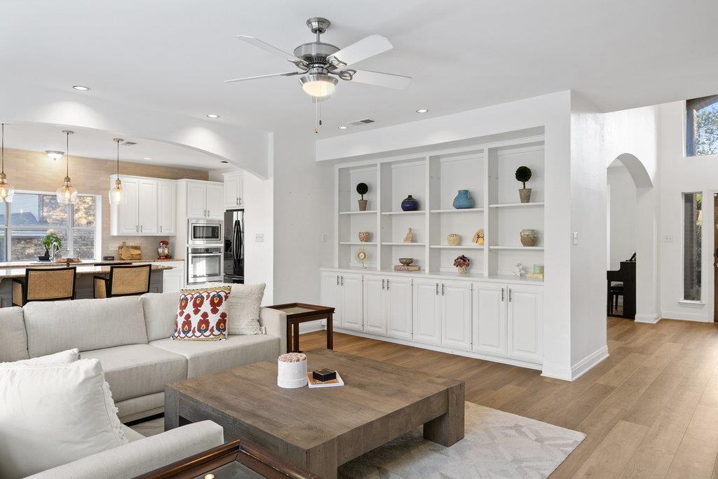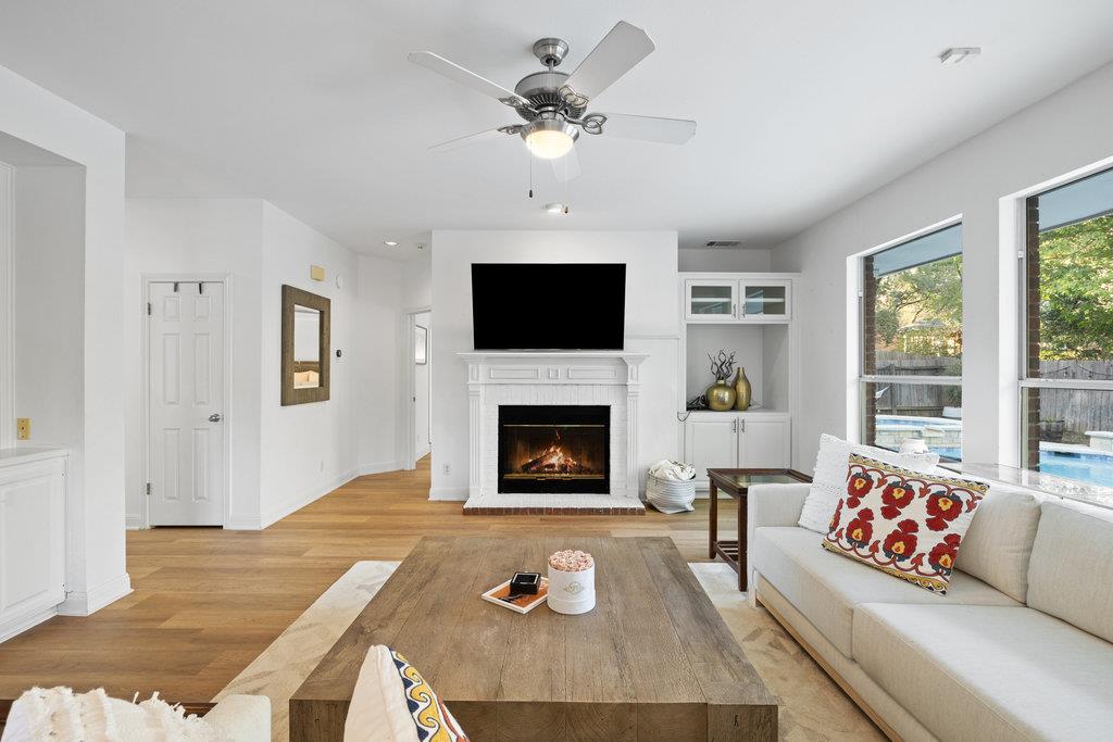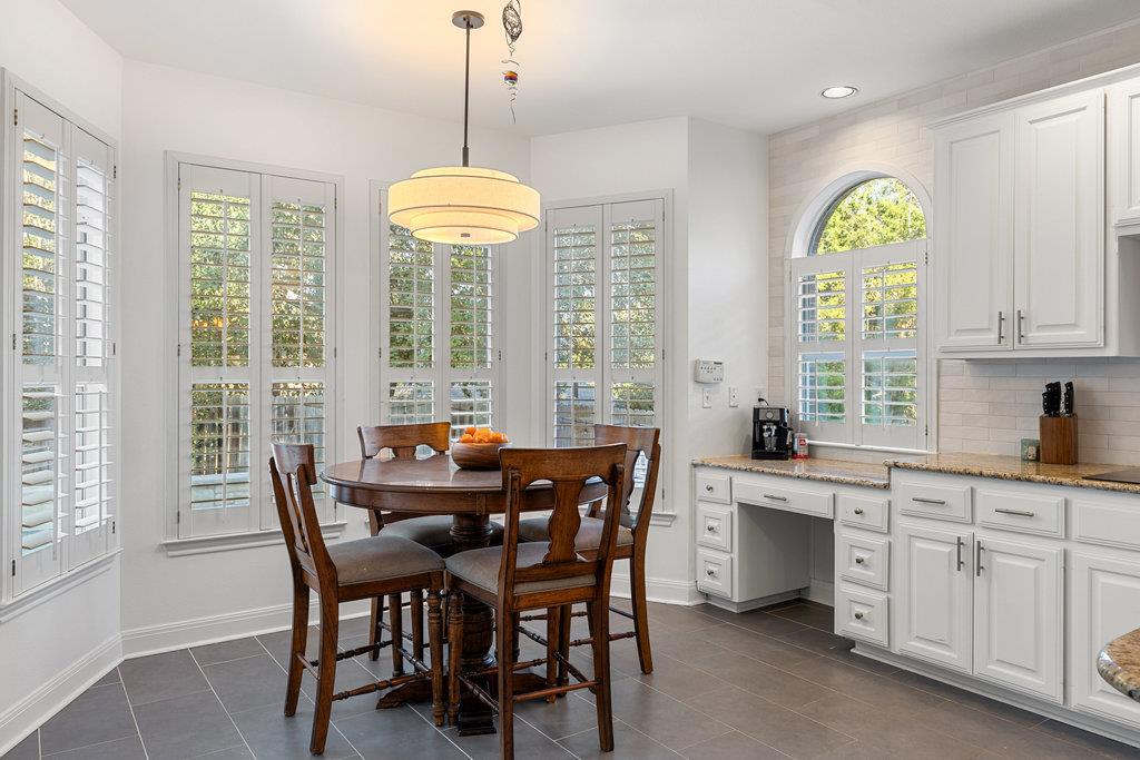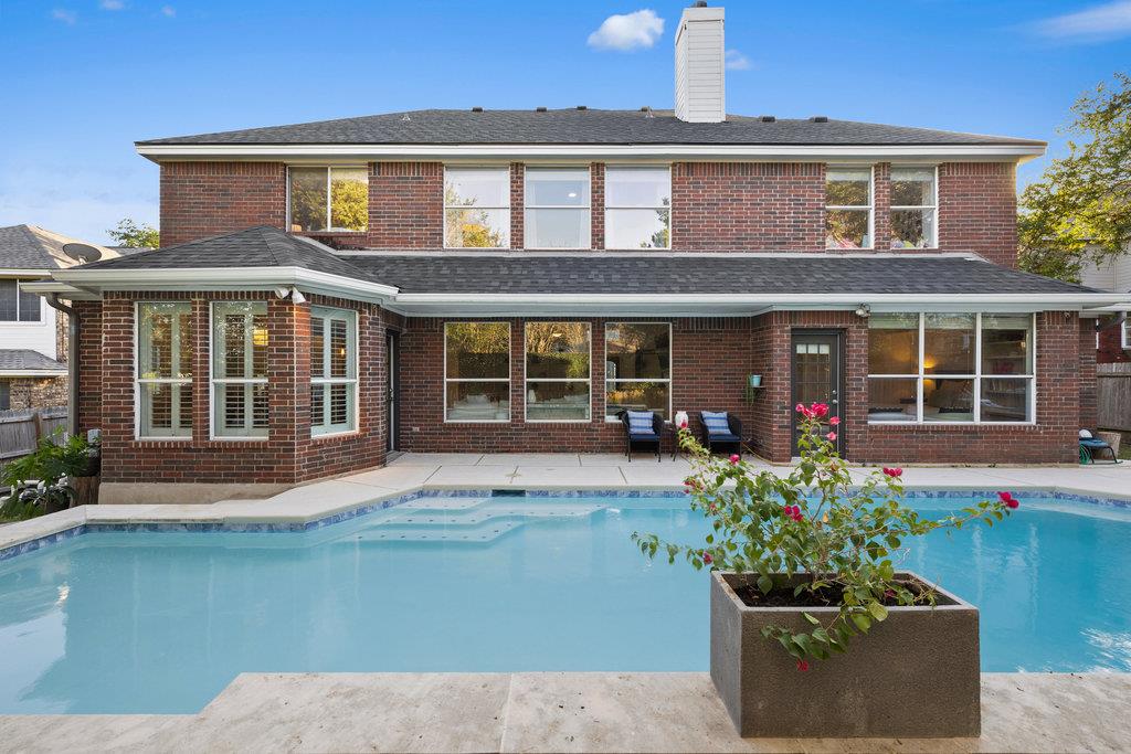 In the coveted Park at Spicewood Springs, this residence immediately sets itself apart. Manicured landscaping and a welcoming front entry hint at the refinement within. Inside, the home opens to formal gathering spaces that highlight craftsmanship and detail. Wood-shuttered windows filter natural light, while a designer chandelier adds warmth and sophistication to the dining room. The layout flows seamlessly into the updated kitchen, thoughtfully designed for those who love to cook and entertain. Granite countertops, a center island with seating, and a stylish backsplash define the space, while a breakfast nook framed by bay windows captures views of the backyard and pool. The main living room is filled with natural light, anchored by custom built-ins and a cozy fireplace, creating a welcoming rhythm that ties the main level together.