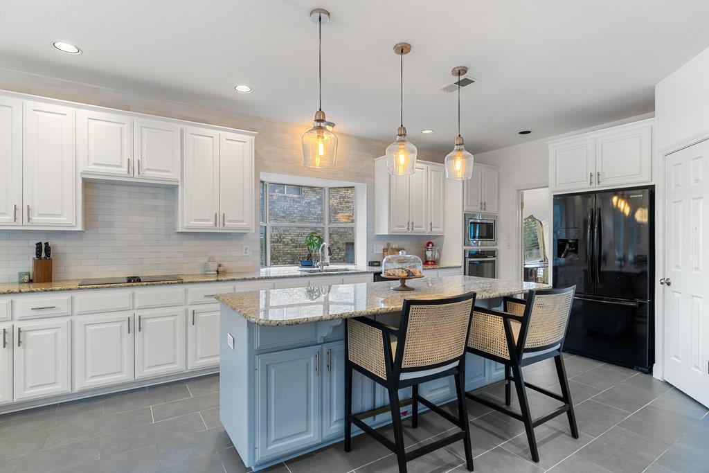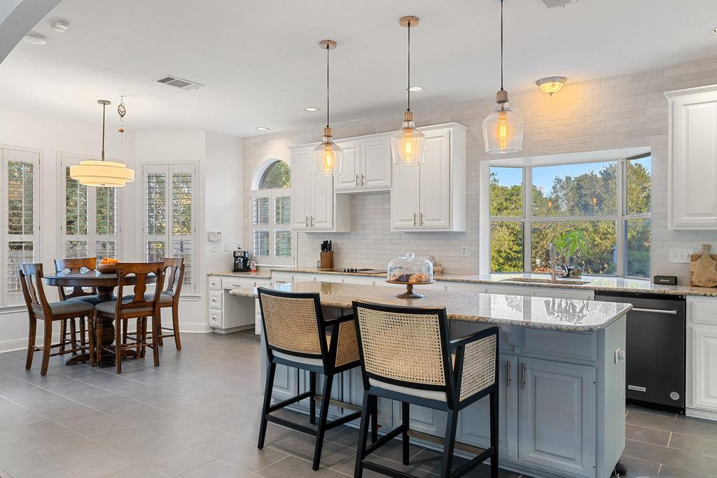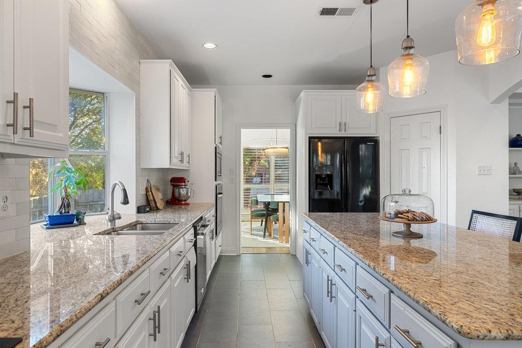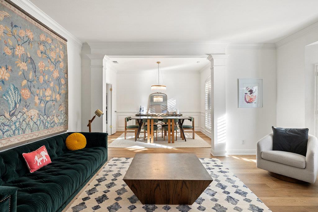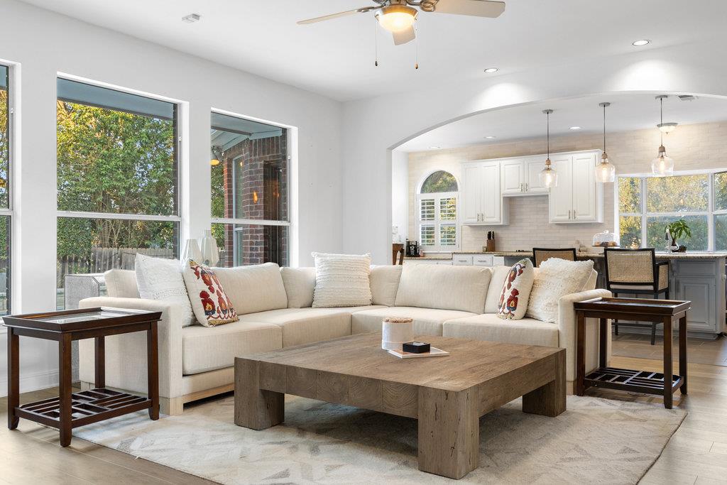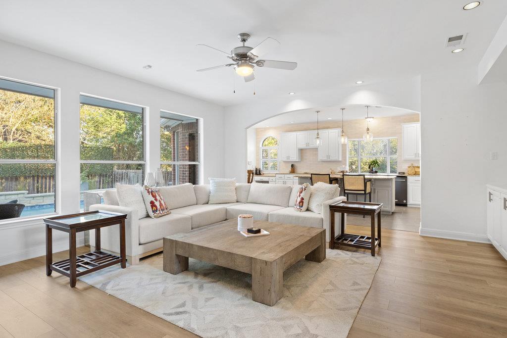 In the coveted Park at Spicewood Springs, this residence immediately sets itself apart. Manicured landscaping and a welcoming front entry hint at the refinement within. Inside, the home opens to formal gathering spaces that highlight craftsmanship and detail. Wood-shuttered windows filter natural light, while a designer chandelier adds warmth and sophistication to the dining room. The layout flows seamlessly into the updated kitchen, thoughtfully designed for those who love to cook and entertain. Granite countertops, a center island with seating, and a stylish backsplash define the space, while a breakfast nook framed by bay windows captures views of the backyard and pool. The main living room is filled with natural light, anchored by custom built-ins and a cozy fireplace, creating a welcoming rhythm that ties the main level together.