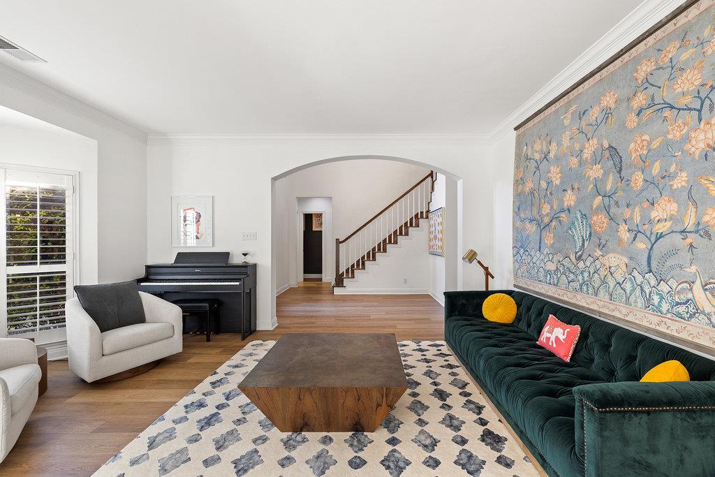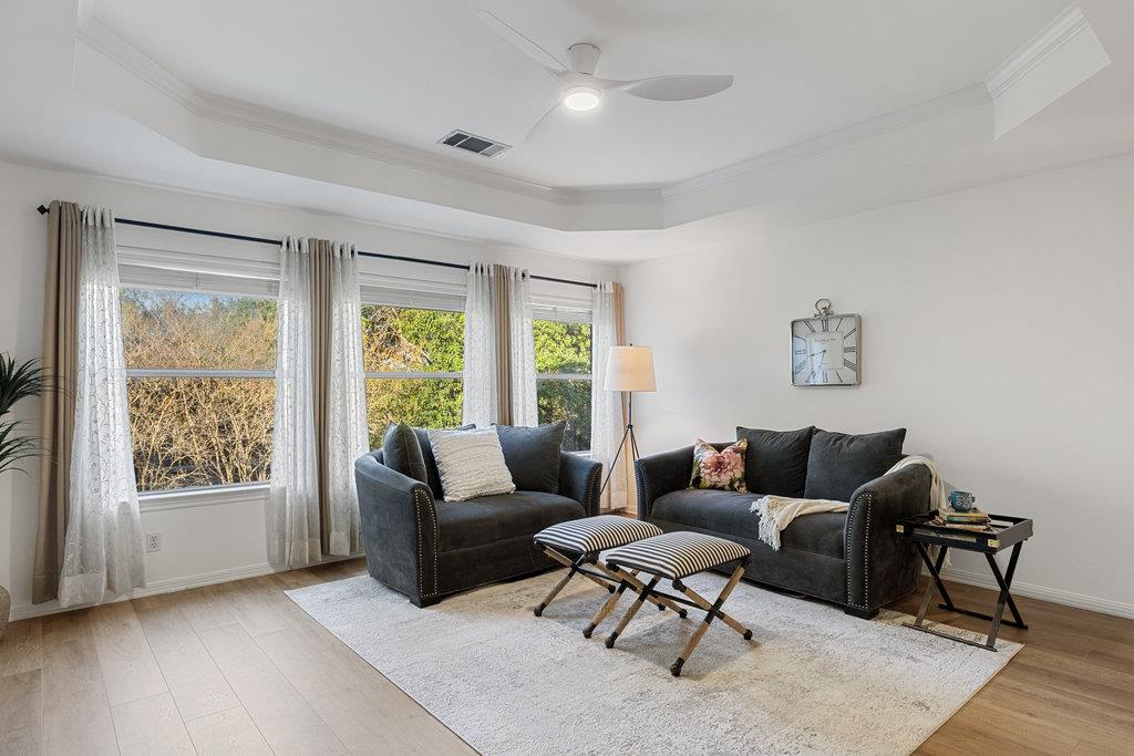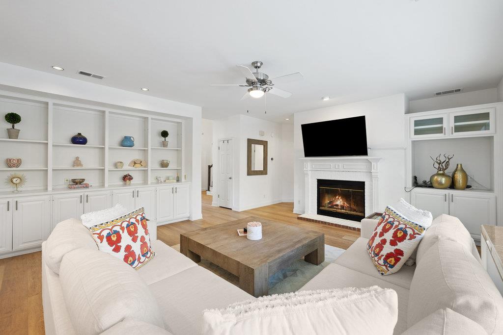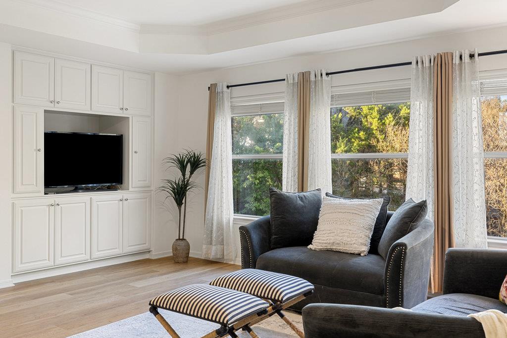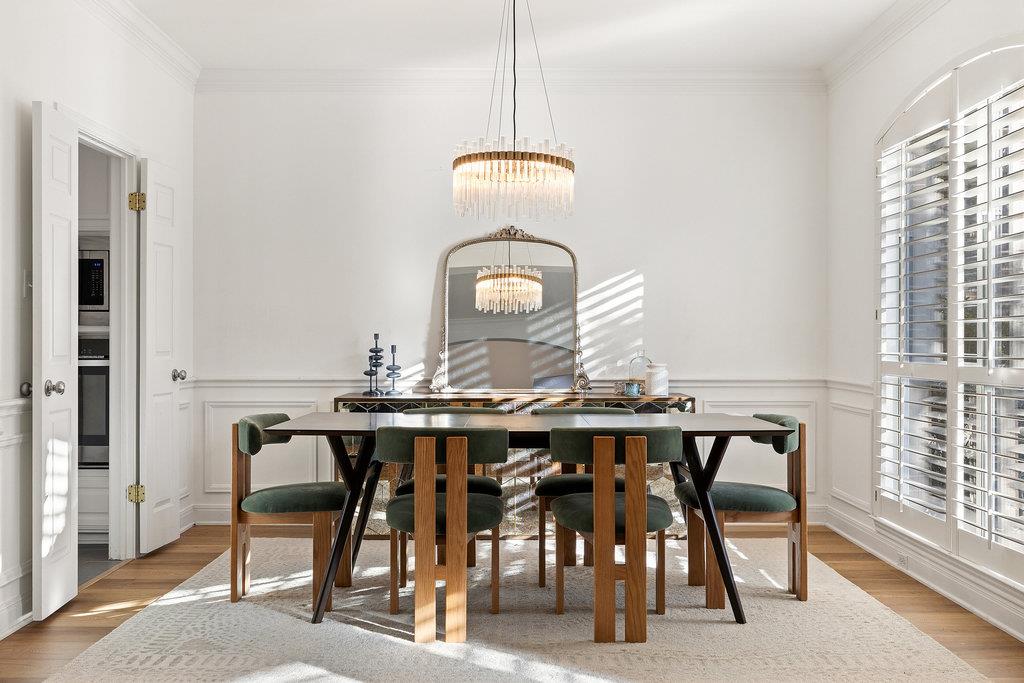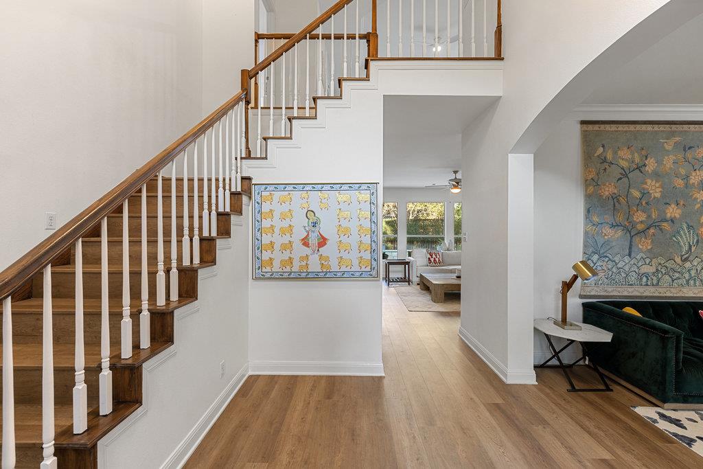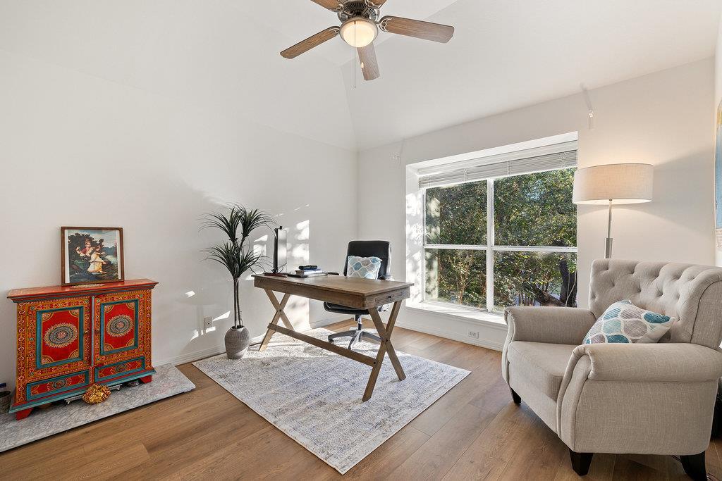 In the coveted Park at Spicewood Springs, this residence immediately sets itself apart. Manicured landscaping and a welcoming front entry hint at the refinement within. Inside, the home opens to formal gathering spaces that highlight craftsmanship and detail. Wood-shuttered windows filter natural light, while a designer chandelier adds warmth and sophistication to the dining room. The layout flows seamlessly into the updated kitchen, thoughtfully designed for those who love to cook and entertain. Granite countertops, a center island with seating, and a stylish backsplash define the space, while a breakfast nook framed by bay windows captures views of the backyard and pool. The main living room is filled with natural light, anchored by custom built-ins and a cozy fireplace, creating a welcoming rhythm that ties the main level together.