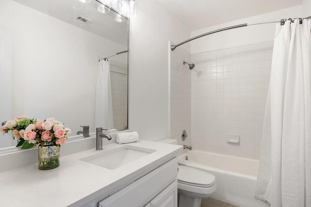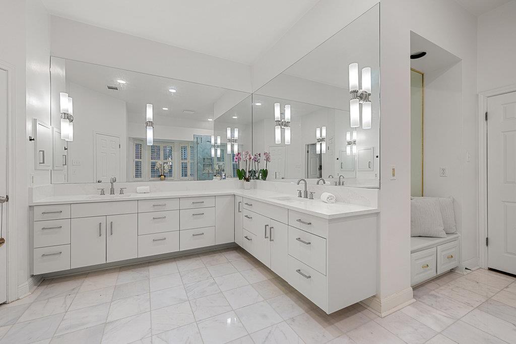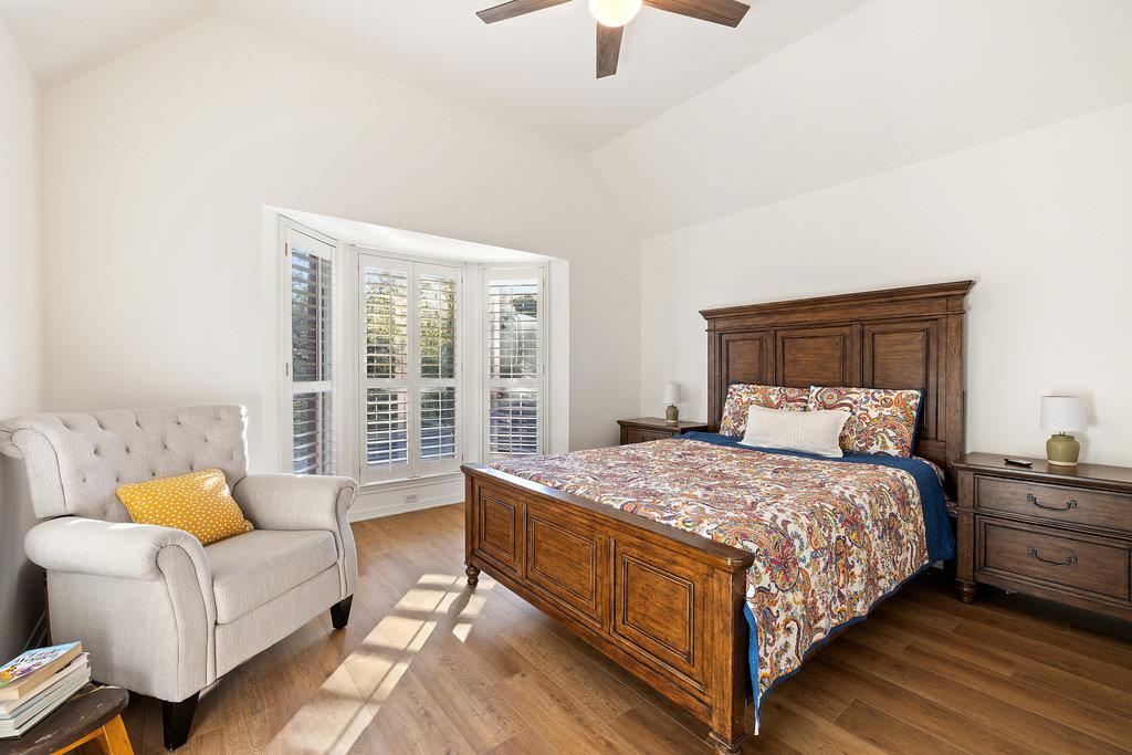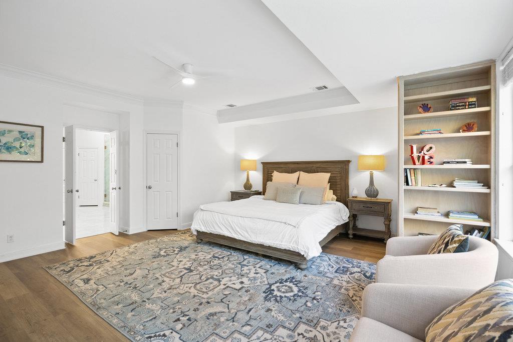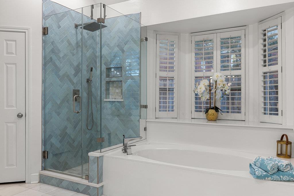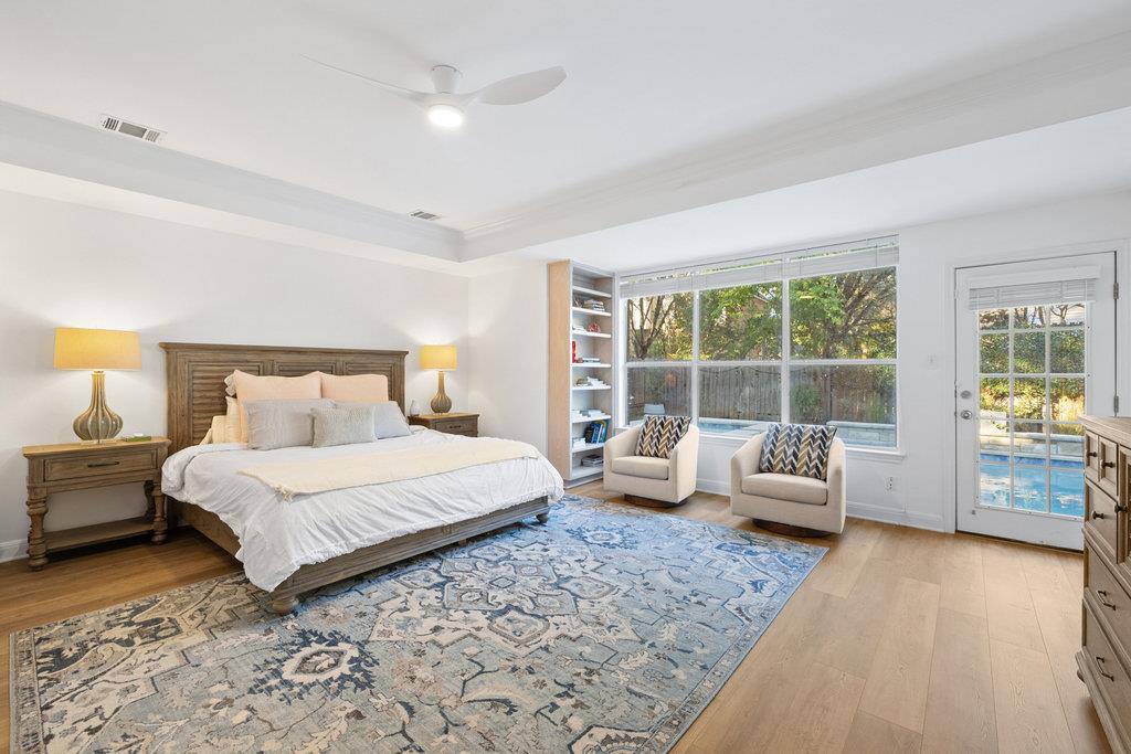 Privately positioned at the back of the home, the primary suite offers a quiet haven. Spacious enough for a sitting area and with direct access to the backyard, it's the perfect spot for morning coffee or evening unwinding. The updated ensuite bath feels like a retreat, featuring a soaking tub, walk-in shower with rainfall head, oversized vanities, walls of mirrors, and finishes that were chosen with care.