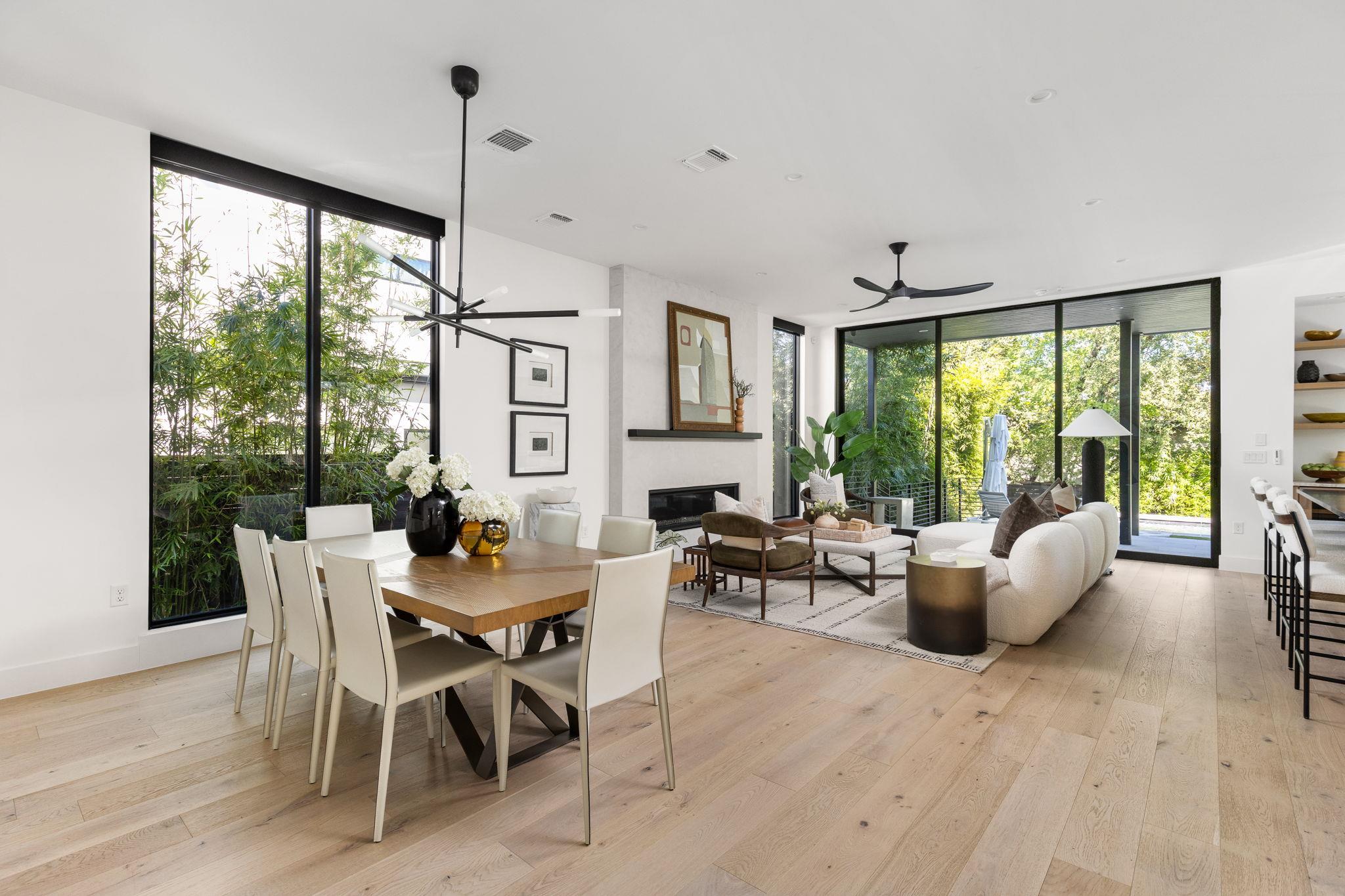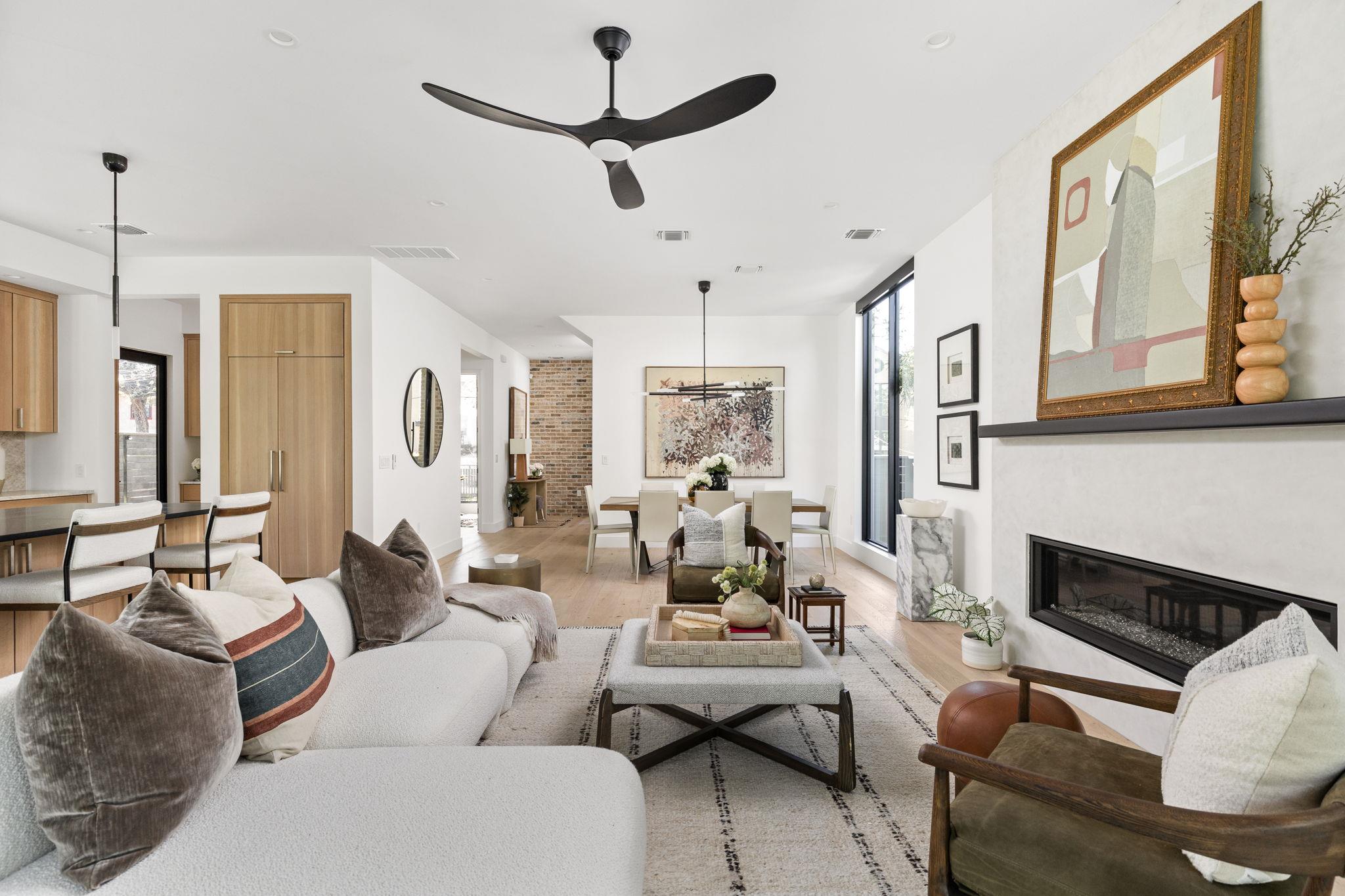 Natural light fills the interiors, where white oak floors and carefully curated finishes create an inviting sense of balance. Each level offers a private balcony, with the third floor terrace revealing sweeping views of downtown Austin. A Venetian plaster feature wall and a Napoleon Vector linear fireplace bring architectural sophistication to the main living space.
